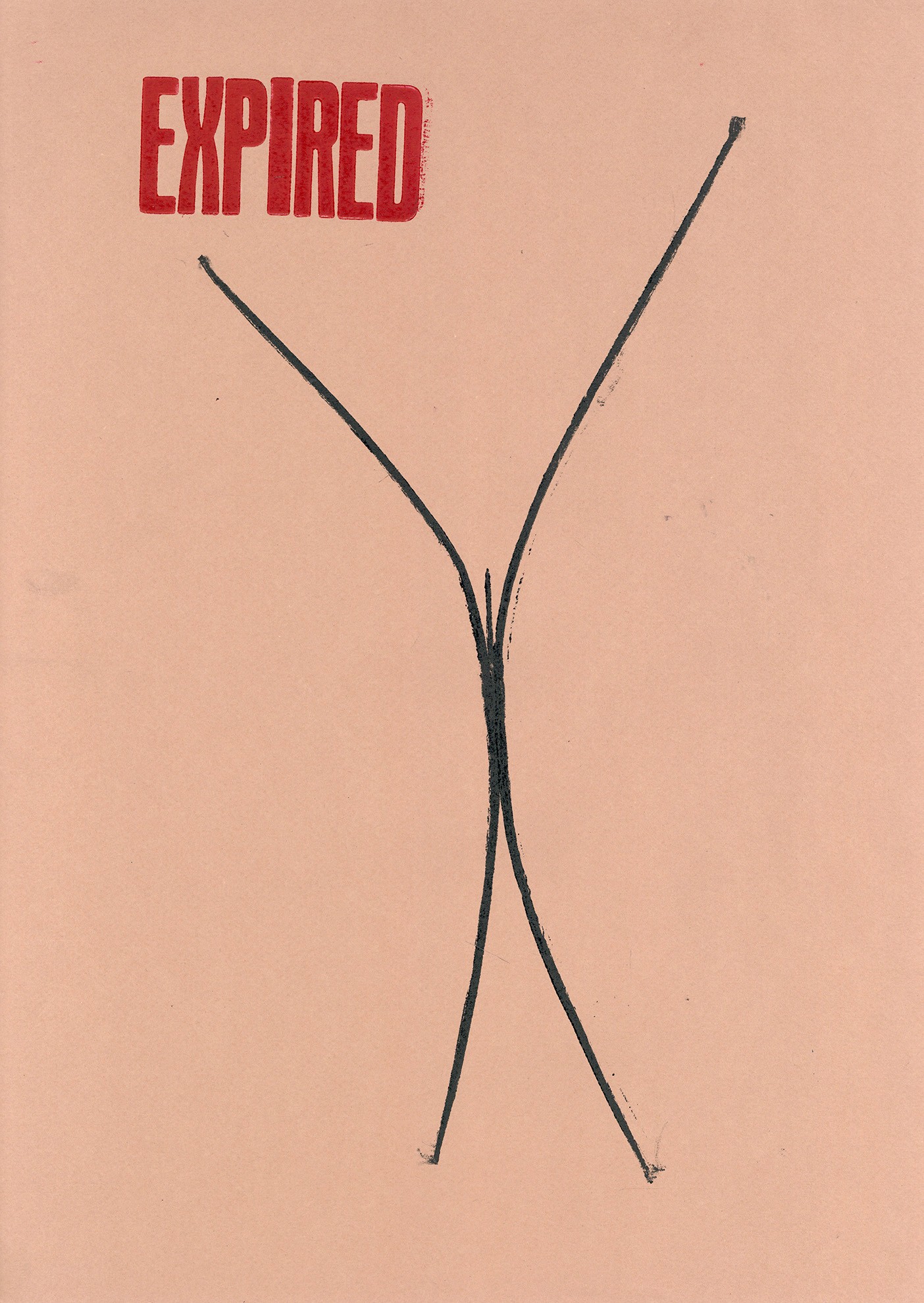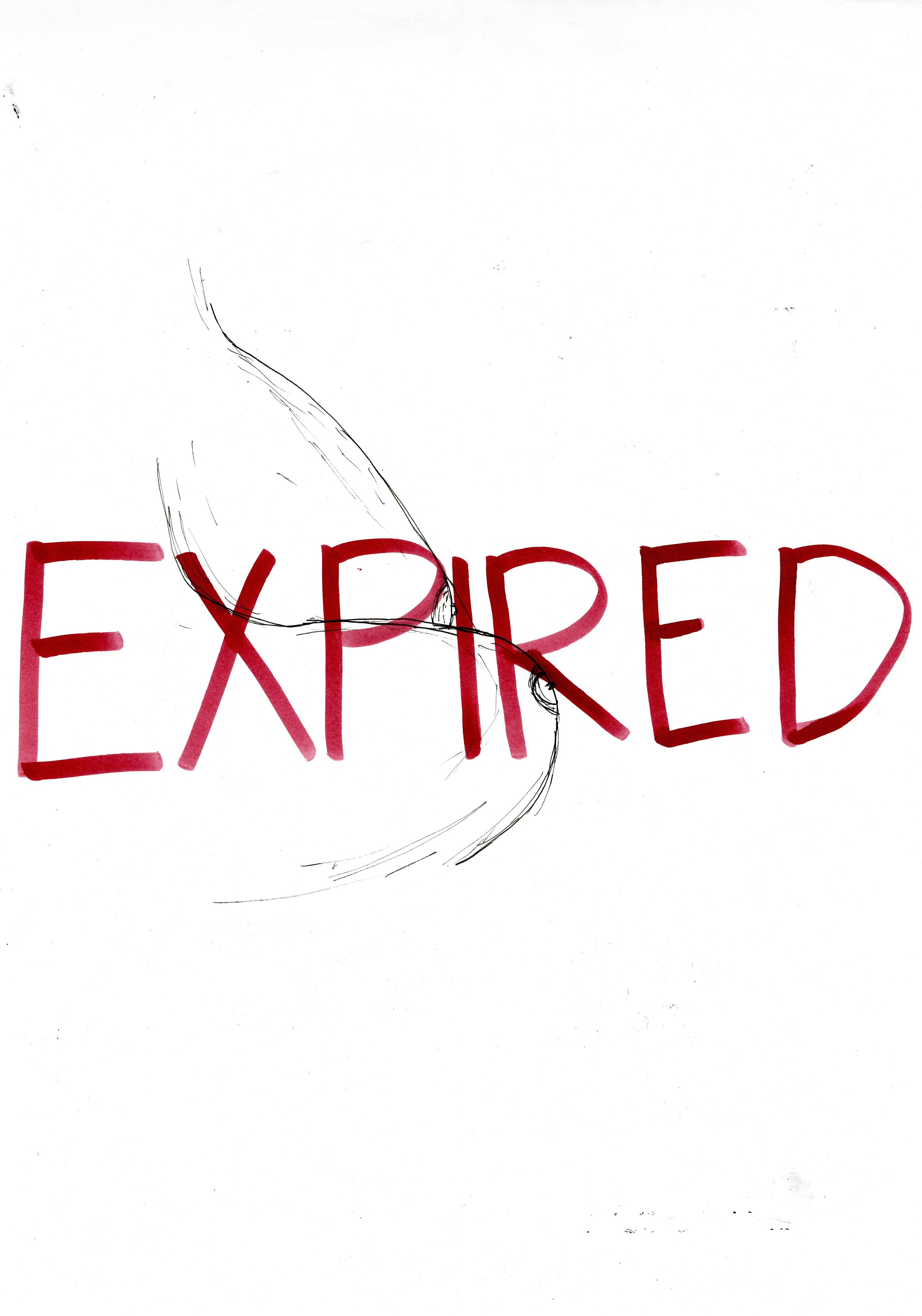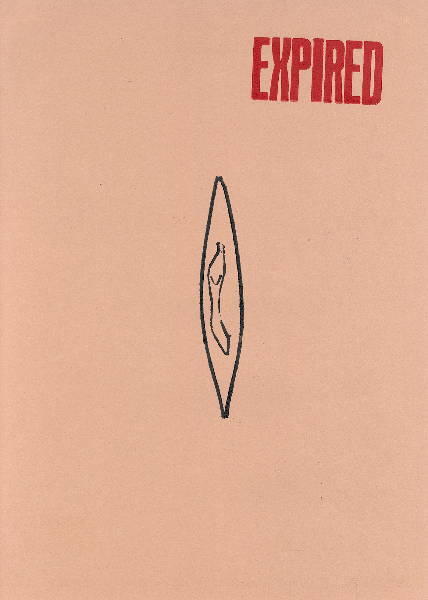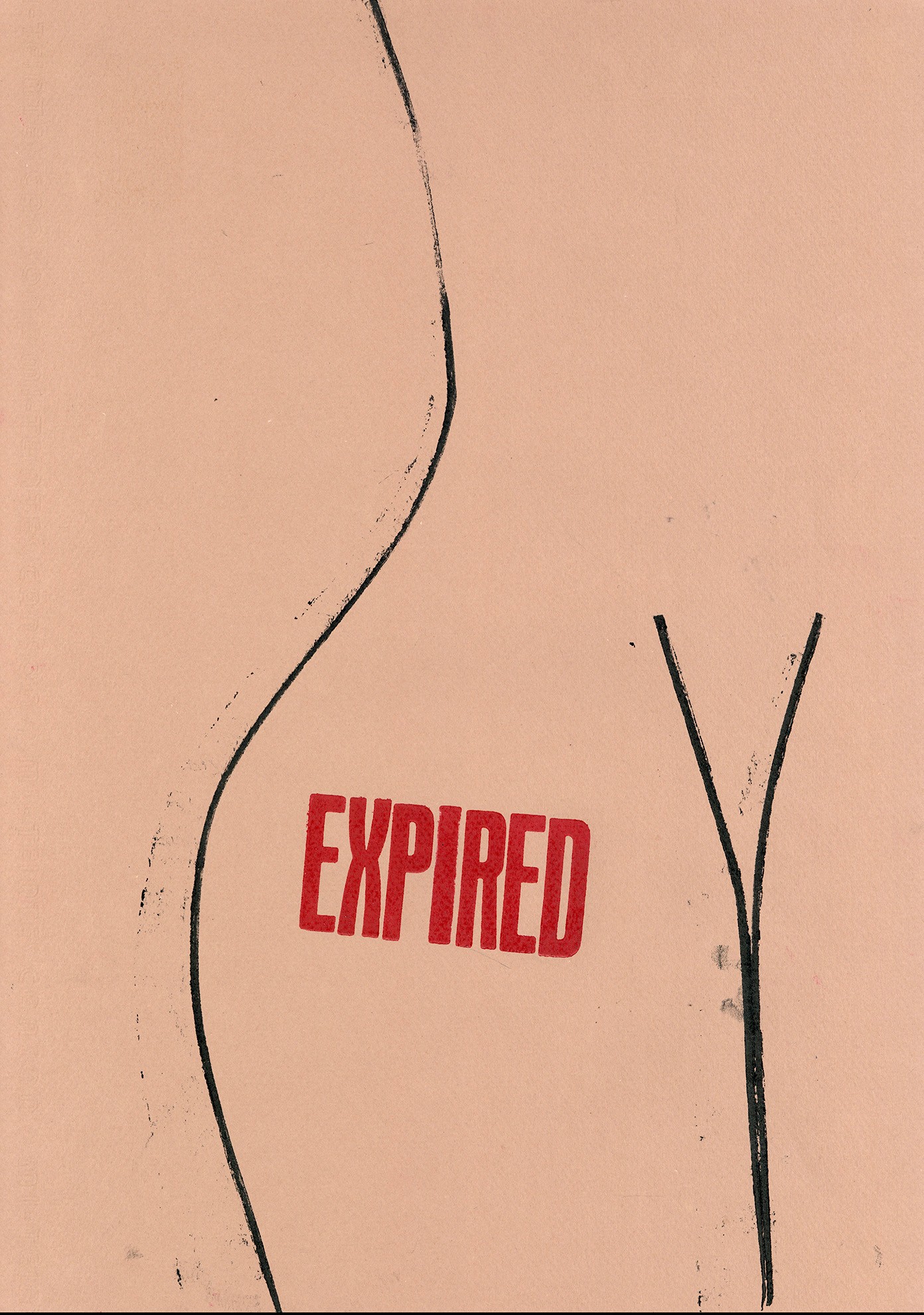 In bold red letters, the word “expired” is printed on paper the color of human skin. The block letters stand in stark contrast to the soft, subtle lines depicting a woman’s genitalia. It appears as if the body has been stamped with a label.