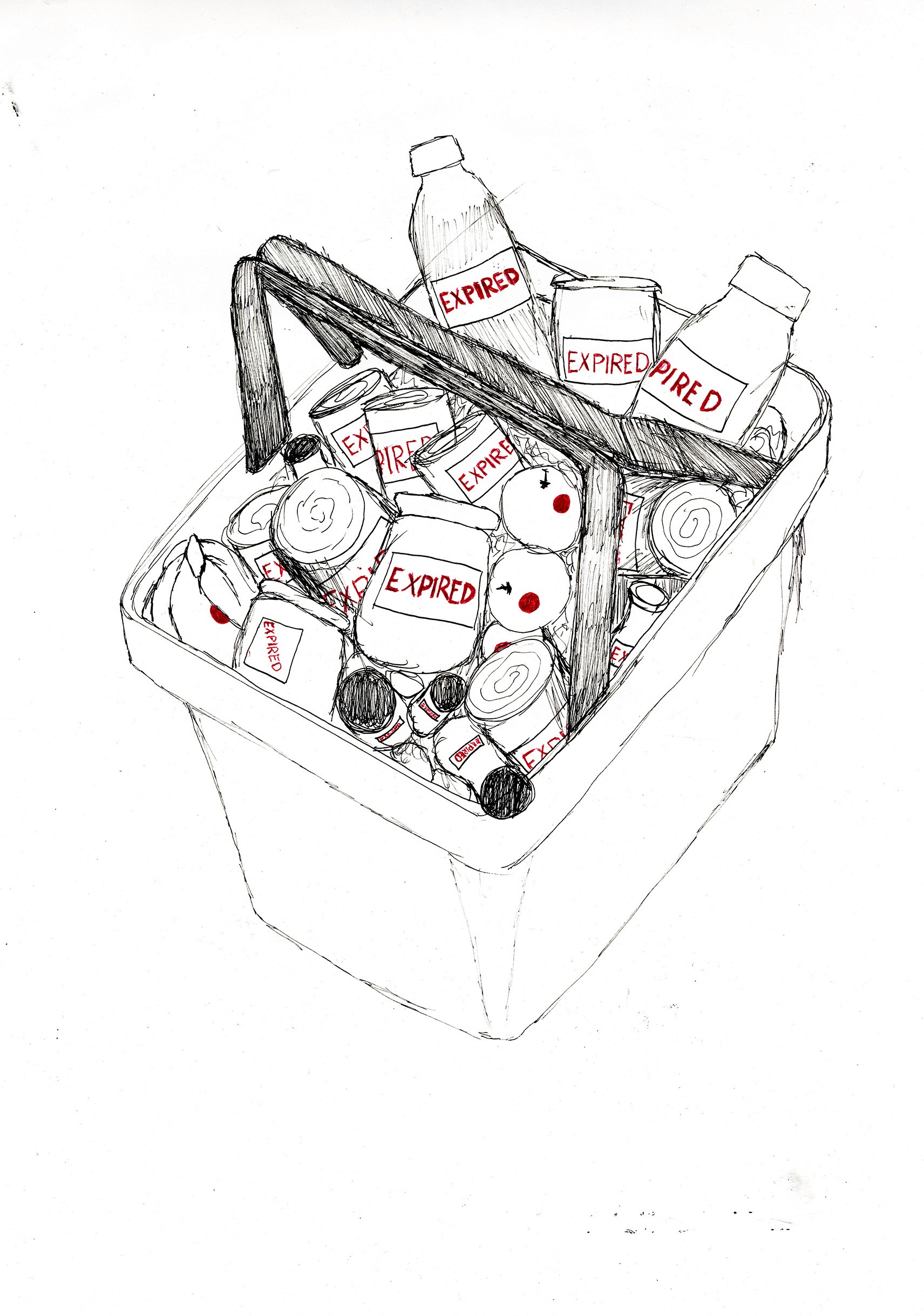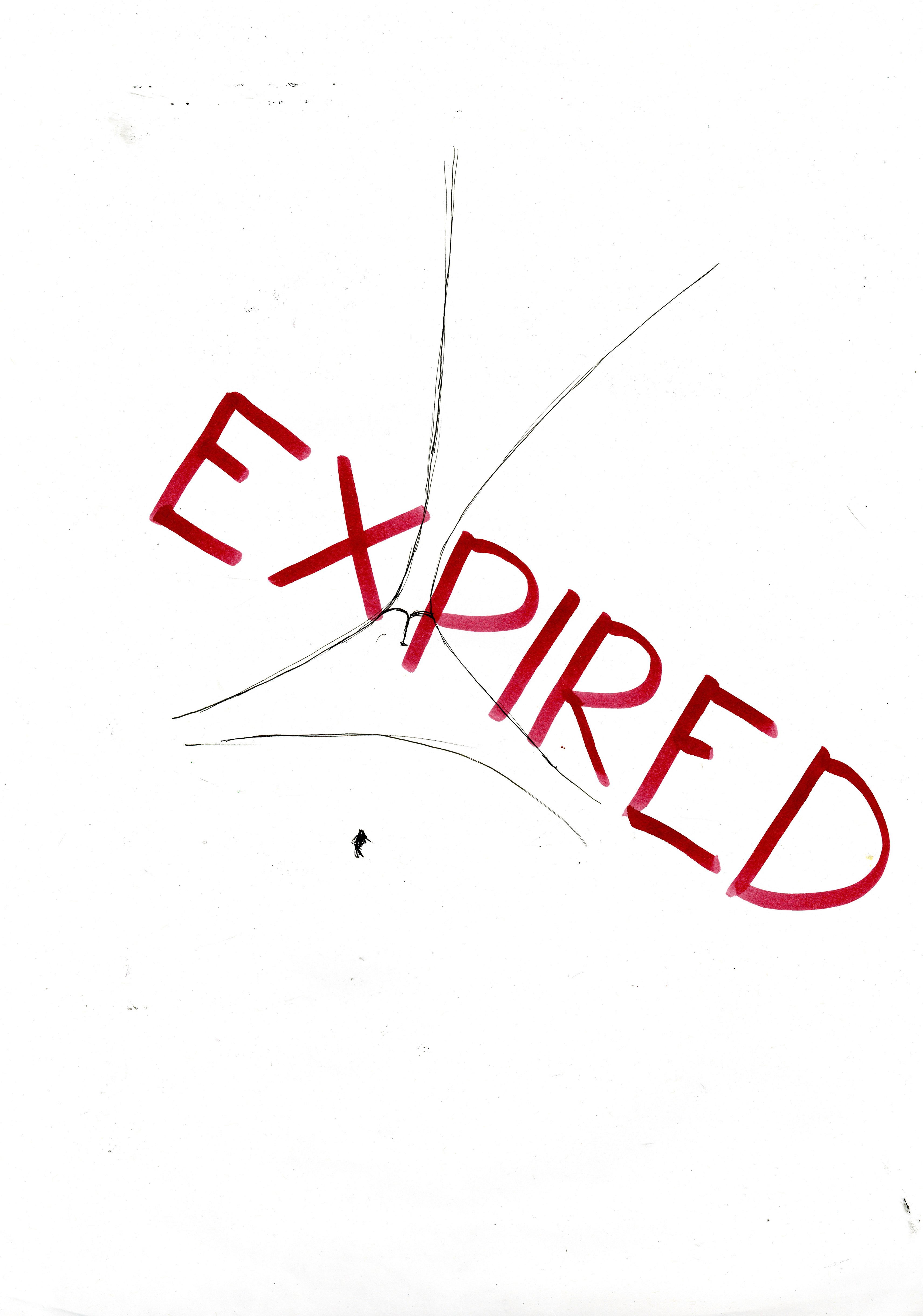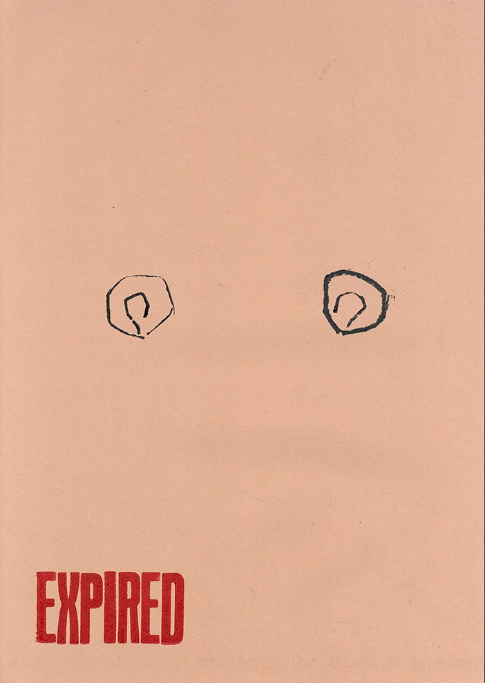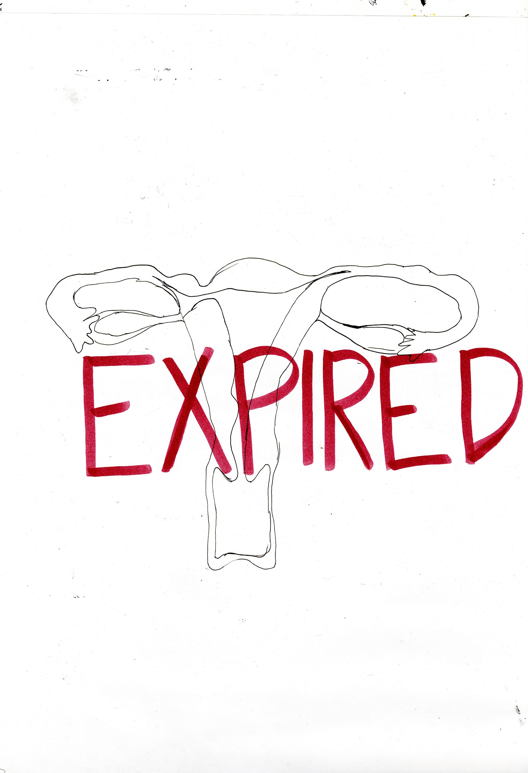 In bold red letters, the word “expired” is printed on paper the color of human skin. The block letters stand in stark contrast to the soft, subtle lines depicting a woman’s genitalia. It appears as if the body has been stamped with a label.